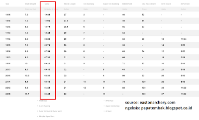 Tapi kita gak usah capek2 tes sendiri, karena biasanya dari pabrik udah ada data lengkapnya. Ini contoh untuk arrow Easton Platinum:
