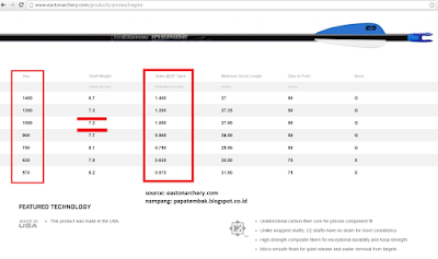 Jadi, misal ada arrow karbon merk easton yang ukurannya 570, maka spine arrow tersebut adalah 570/1000 = 0.570 inch.