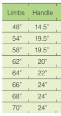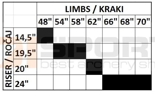 Panjang limbs ada beberapa ukuran, begitu juga dengan panjang riser. Untuk standard bow bisa dilihat lengkapnya di tabel di bawah ini: