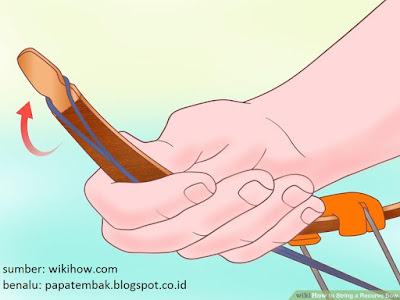 Tangan kanan sambil dorong limb atas juga sambil geser string ke posisi limb nock