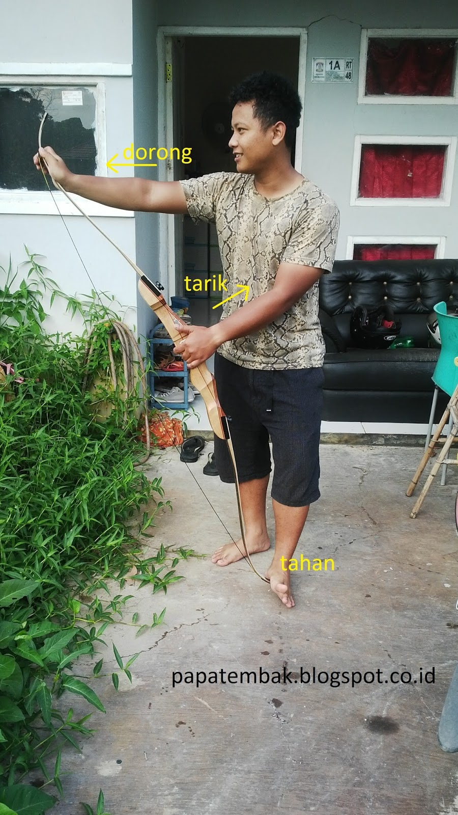 Tangan kanan dorong limb atas, tangan kiri tarik handle/riser, kaki tahan limb bawah