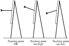 Apa yang terjadi kalo posisi nocking point salah? Kalo nocking point terlalu tinggi, arrow/anak panah akan menukik (point lebih rendah daripada nock). Kebalikannya kalo nocking point kerendahan, nanti si arrow/anak panah pointnya bakal ngangkat (point lebih tinggi daripada nock).