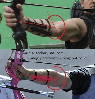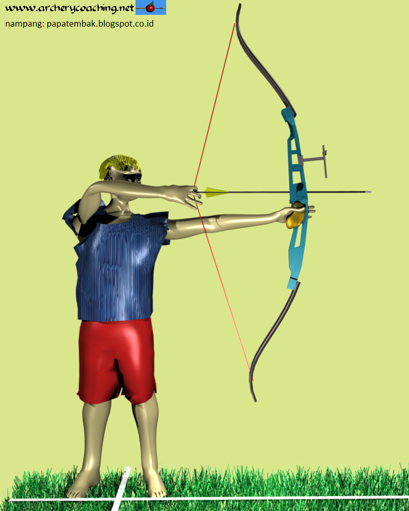 bahu kiri dan kanan tetep sejajar. Biasanya kalo belum terbiasa bahu yang nahan bow/busur suka naek karena nahan berat.