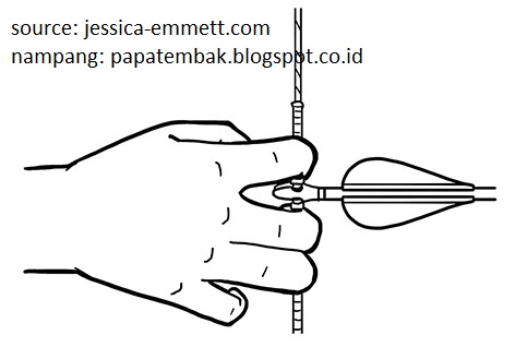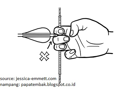 Masangin nock ke nocking point sampe bunyi klik. Yang harus diperhatikan disini adalah fit atau nggaknya itu nock ke string. Kalo terlalu kenceng ngaruhnya ke akurasi, tapi gak begitu masalah kalo buat pemula yang masih mempelajari teknik, belum penting kalo masalah akurasi. Yang bahaya itu kalo terlalu longgar. Bayangin kalo ditengah proses narik string terus si nocknya melorot atau lepas dari string dan kelepasan ngerelease. Bisa lari ke jidat orang itu arrow/anak panah.