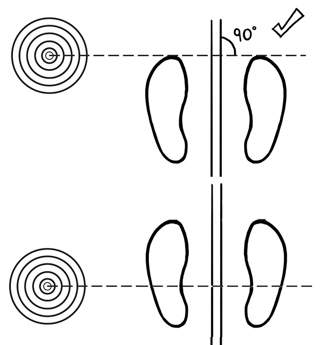 Kalo bidikannya geser ke kiri, geser kaki yang ada di depan maju ke arah center line. dan sebaliknya kalo bidikannya geser ke kanan, geser kaki yang ada di depan mundur menjauhi center line. Atau kalo mau memodifikasi posisi kaki yang di belakang juga boleh, asal nyaman aja. Lebarnya bukaan kaki tetap selebar bahu aja ya.